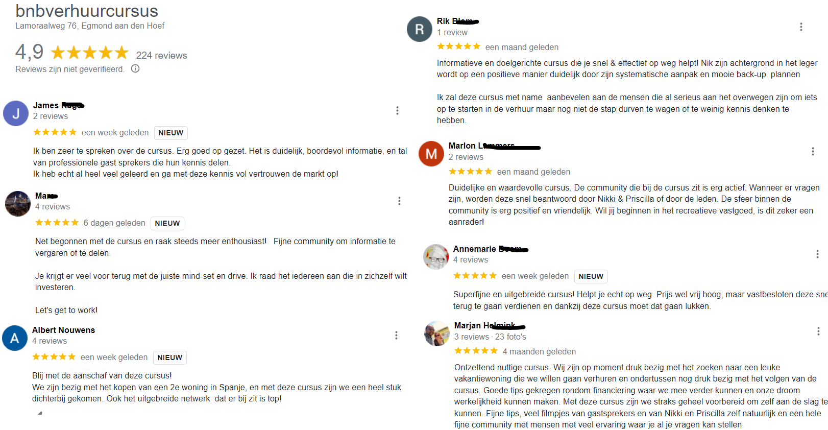 Mensen die de cursus al hebben gevolgd, geven het hoge cijfers. Ze zeggen dat ze veel hebben geleerd en nu succesvol zijn in het verhuren van hun woningen.